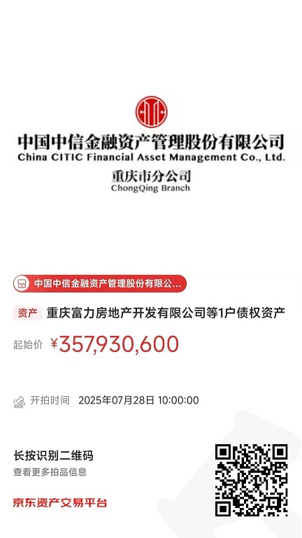 中國中信金融資產(chǎn)管理股份有限公司重慶市分公司(以下簡稱“中信金融資產(chǎn)重慶分公司”)持有的對(duì)重慶富力房地產(chǎn)開發(fā)有限公司等1戶債權(quán)資產(chǎn)定于2025年7月28日10時(shí)至2025年7月29日10時(shí)止(延時(shí)的除外)在京東資產(chǎn)交易平臺(tái)(網(wǎng)址https://zcpm.jd.com/)進(jìn)行公開競價(jià)活動(dòng),拍賣鏈接如下圖所示,競拍相關(guān)事宜詳見拍賣鏈接里的競拍公告及競拍須知,現(xiàn)予以公告。